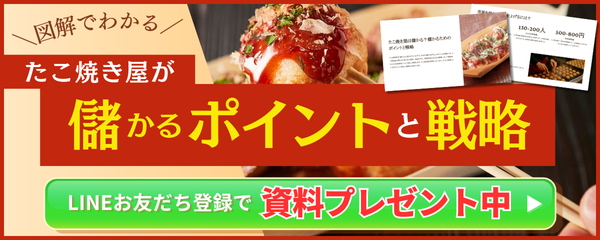下記のバナーから公式LINEにご登録いただくと「たこ焼き屋が儲かるポイント」の図解入り資料をプレゼント! ご登録後にメッセージで「たこ焼き屋儲かる 資料ダウンロード」と送信いただくと無料ダウンロードしていただけます。